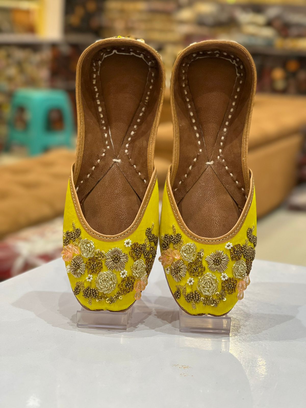 These Beautiful Punjabi Juttis are specially handcrafted for your feet using very soft leather to provide you comfort with a traditional feel. The upper part is decorated with Golden Threads & Wires and Mirrors enclosed using our traditional embroidery technique which gives it a unique look.Elegance and cute are the two words that are perfect for these fab pairs of Punjabi Jutti. Beautiful, multi coloured floral patterns have been hand embroidered with beads and stones. The efficacy of the artisans is visible through the intricate embroidery work. The Jutti has a cushioned insole to provide great comfort for your feet.
