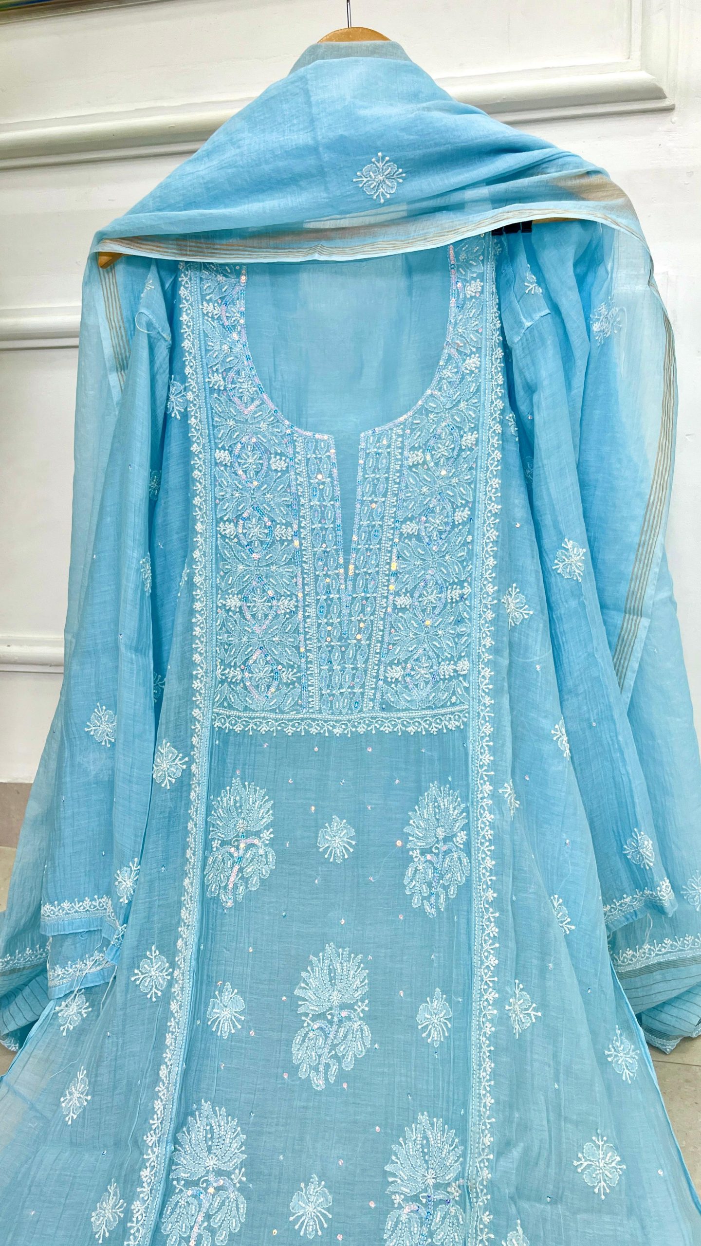 Hand Embroidered Pure Soft Mul Semi stitched Suit Piece Kurta & Dupatta set with Colour – Light Pastel Blue