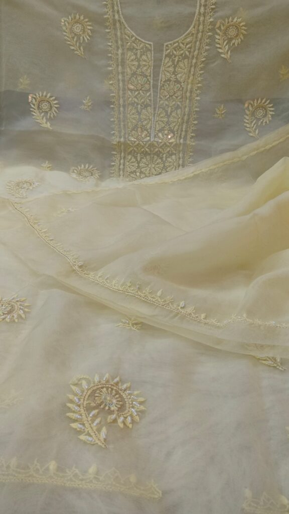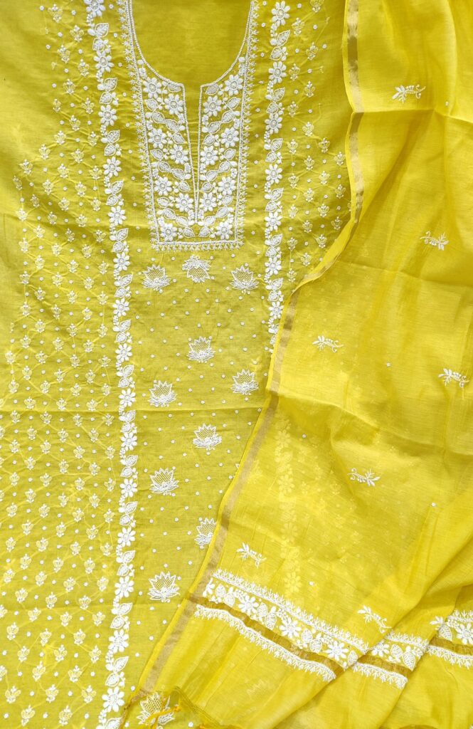 Hand Embroidered Pure Soft Mul Semi stitched Suit Piece Kurta & Dupatta set with Superfine Chikankari embellished with Sequins & Pearl work 🌸
