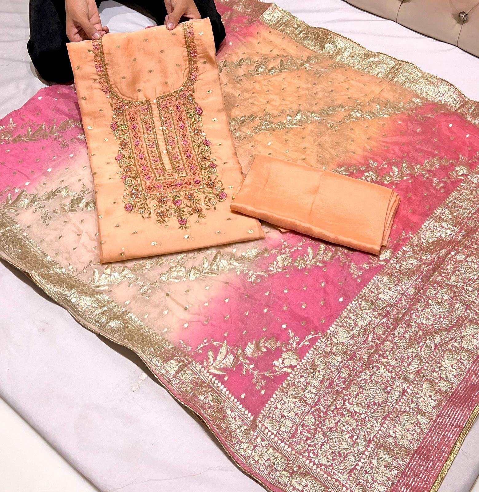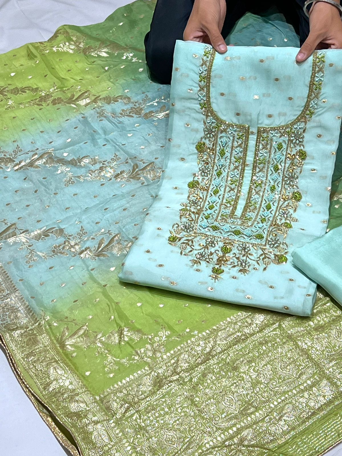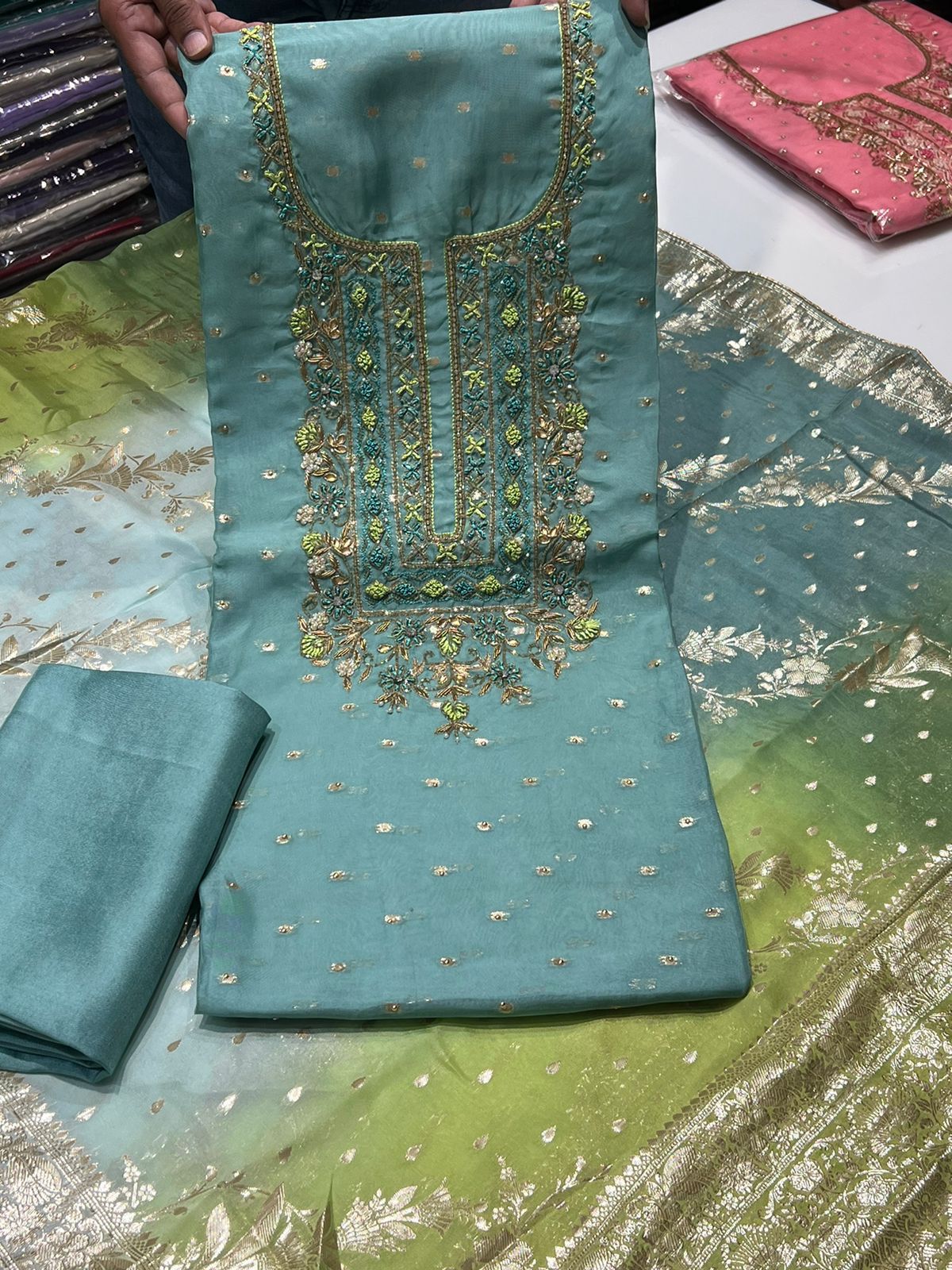 Be the first to review “Handwork Embroidery Viscose Organza Booti Shirt Banarsi nd Dupatta With Plain Silk Bottom” Cancel reply