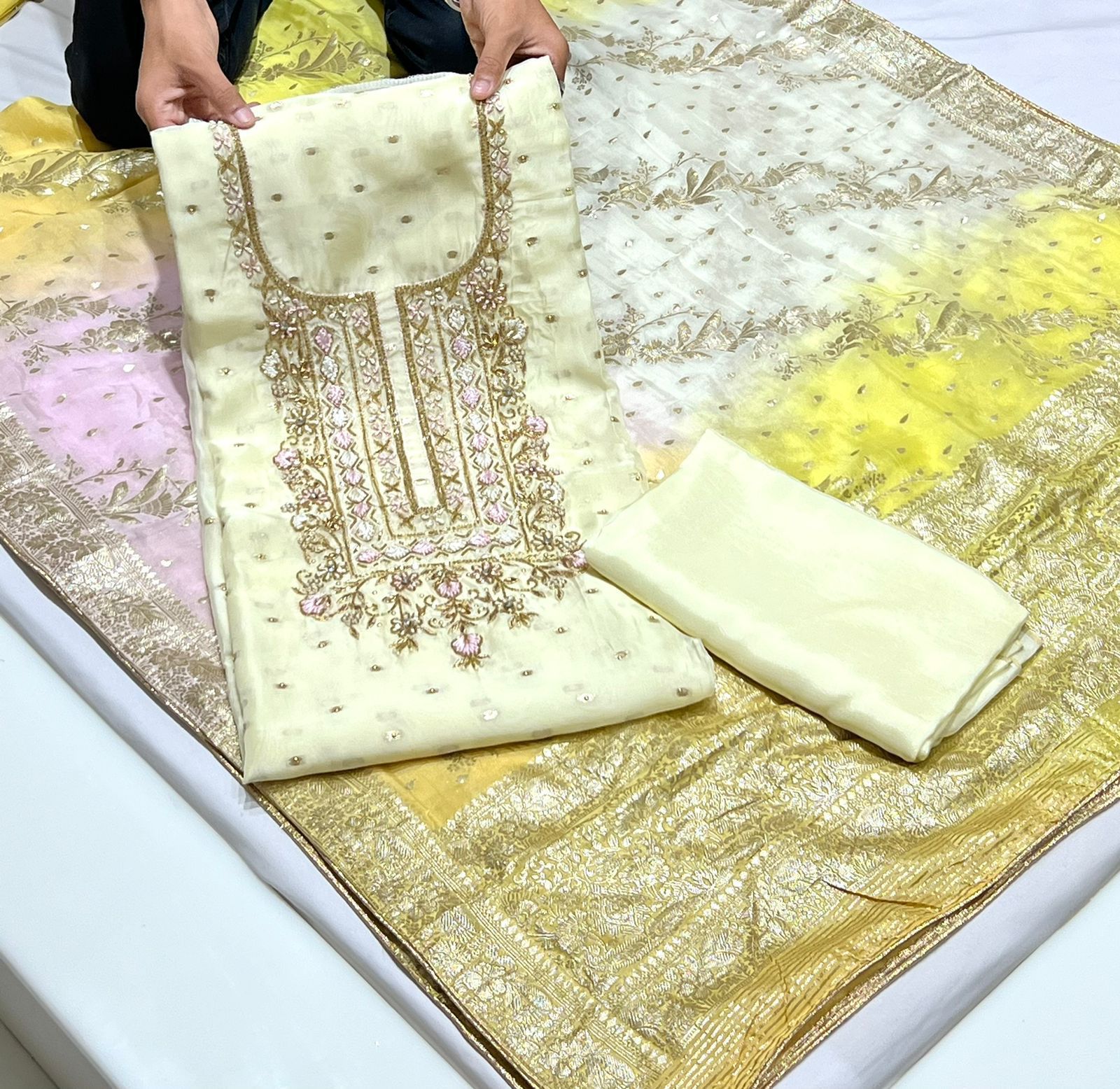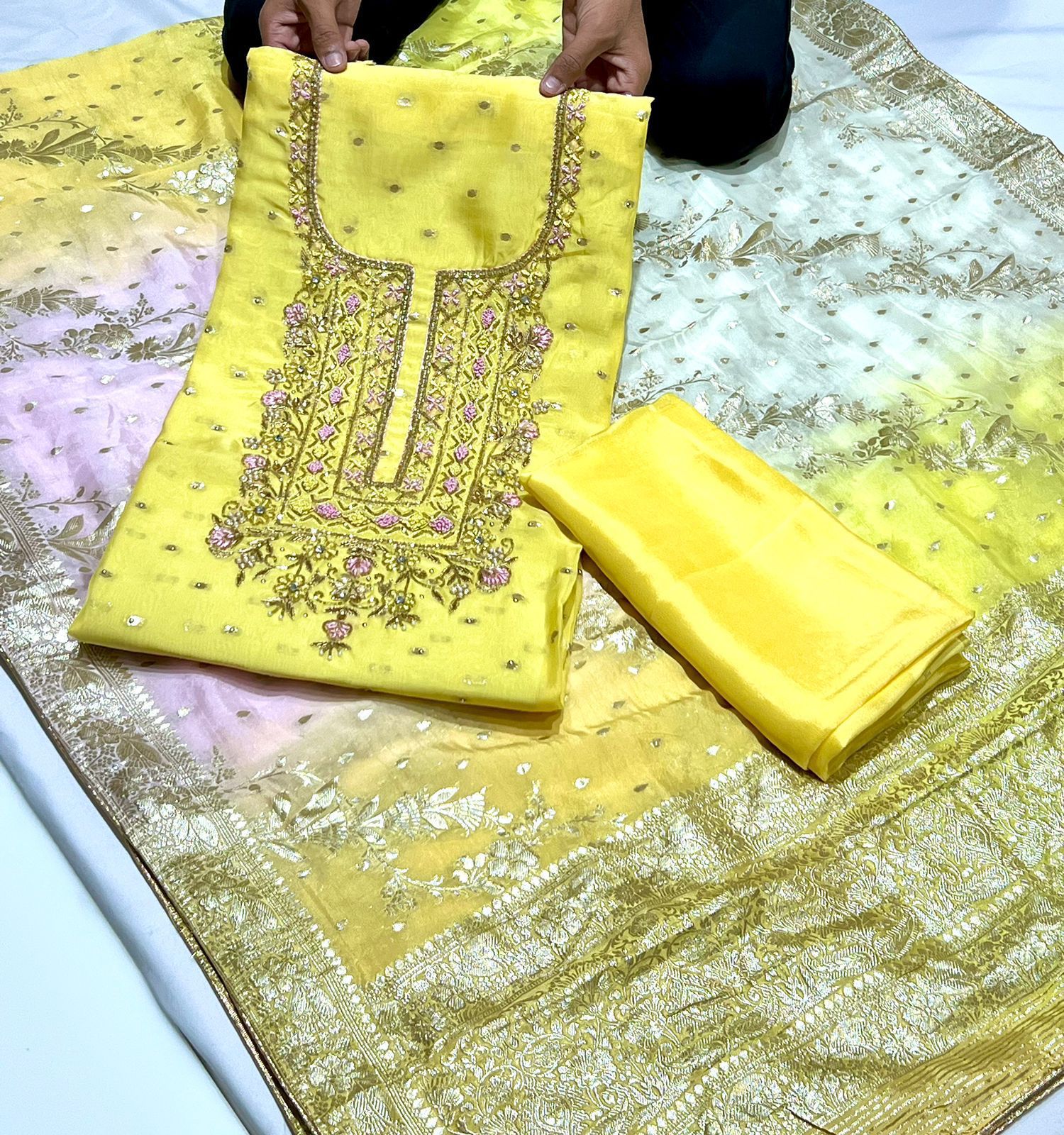 Handwork Embroidery Viscose Organza Booti Shirt Banarsi nd Dupatta With Plain Silk Bottom
