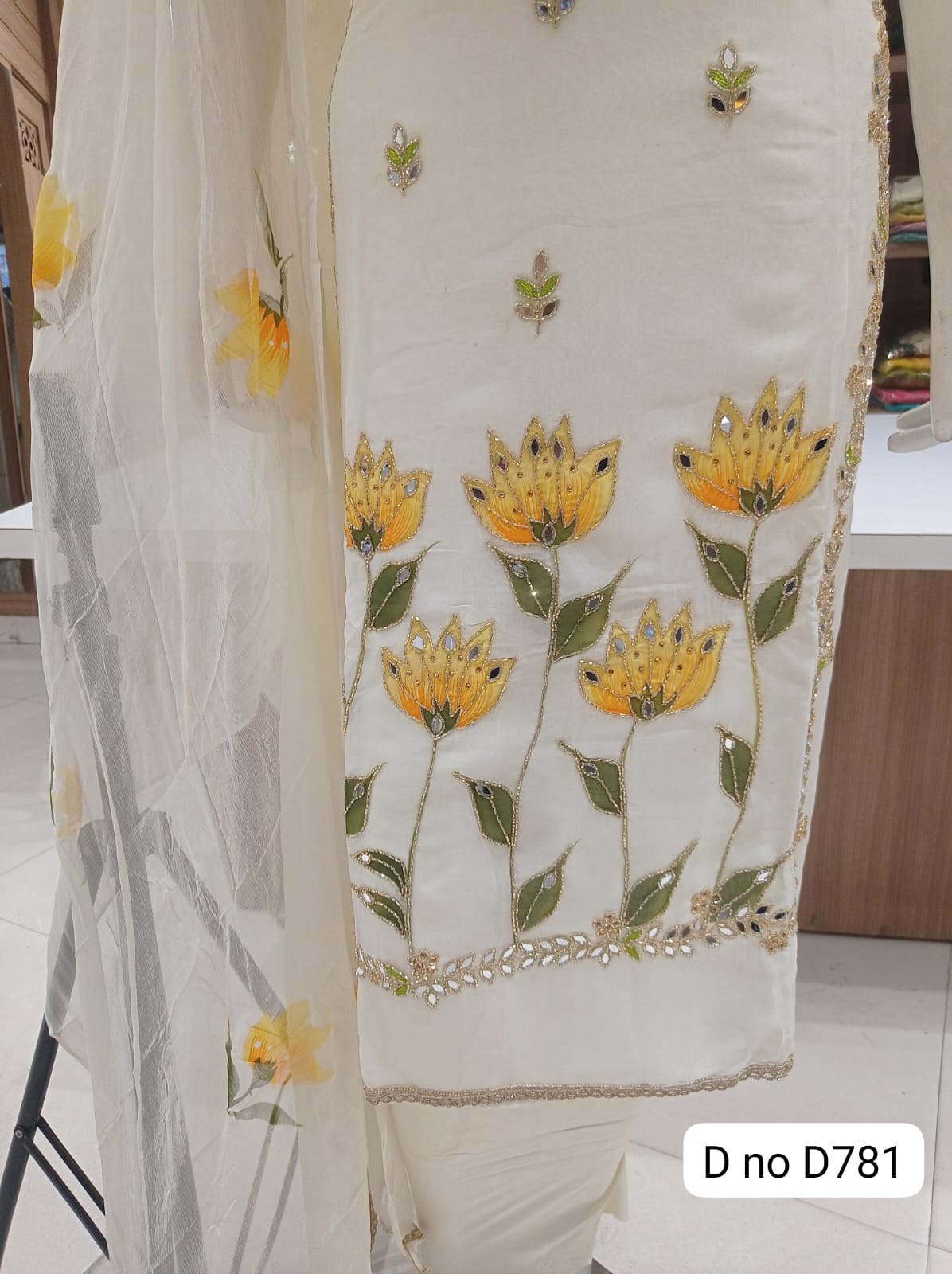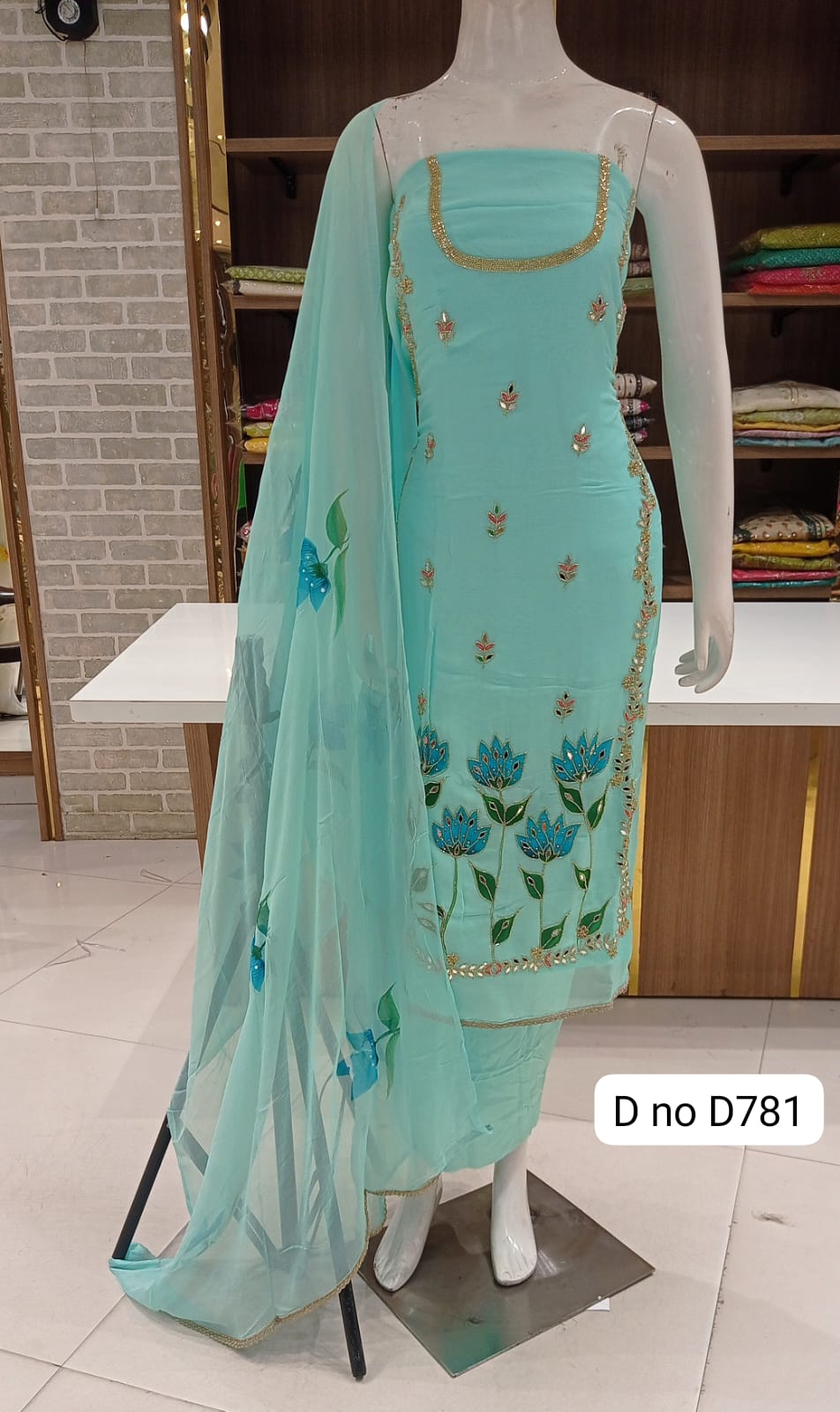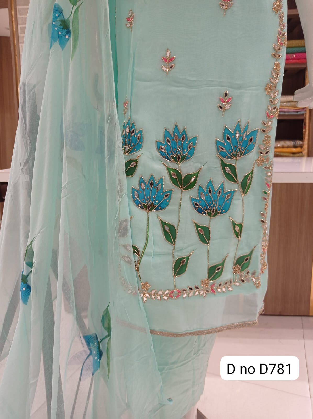 Imported soft organaza dress material with beautiful front hand work Original mirror work Sleeves beautiful work