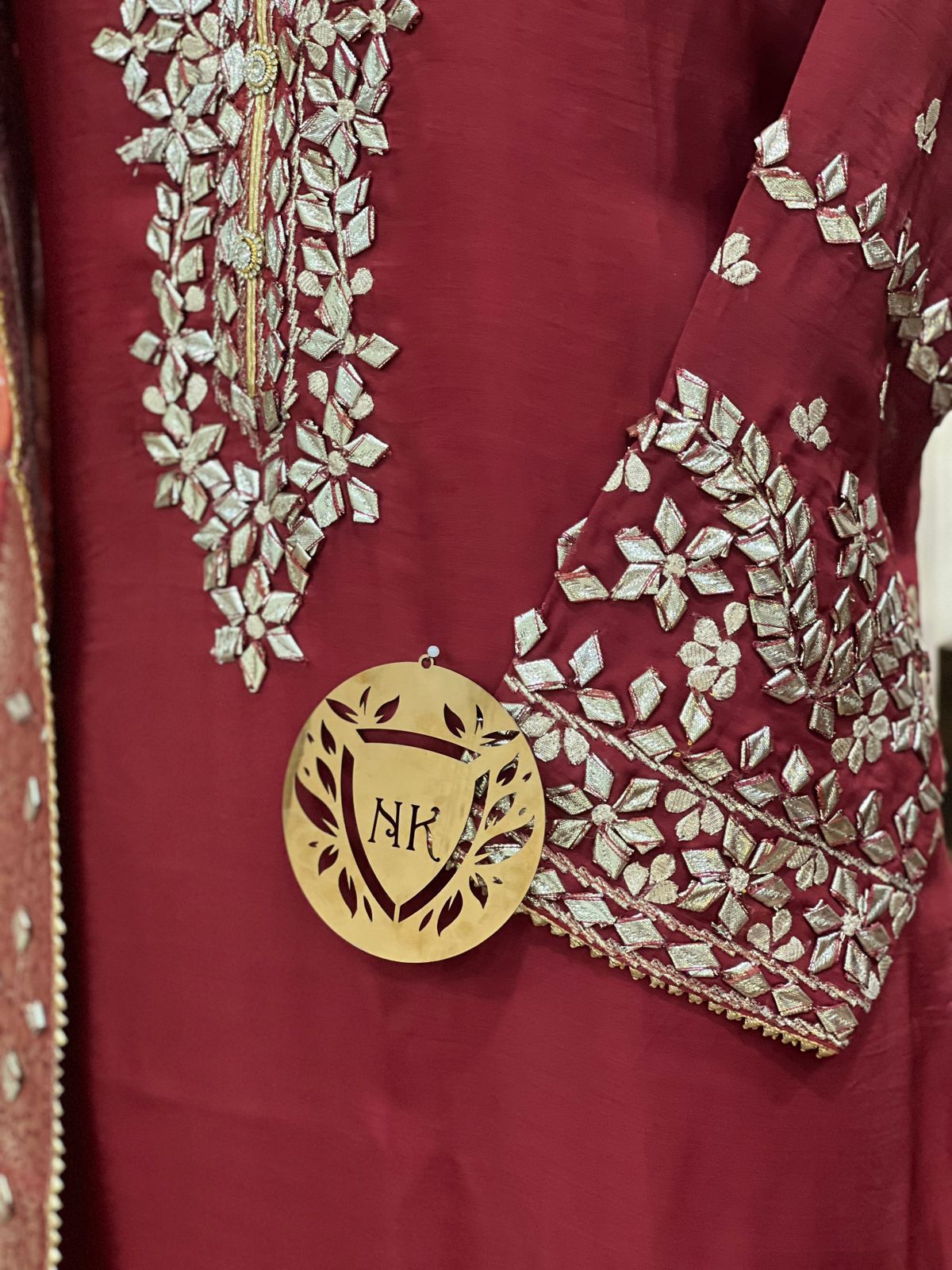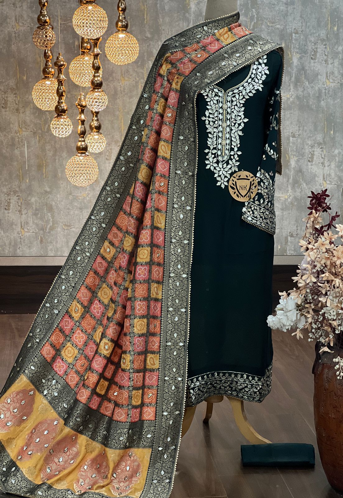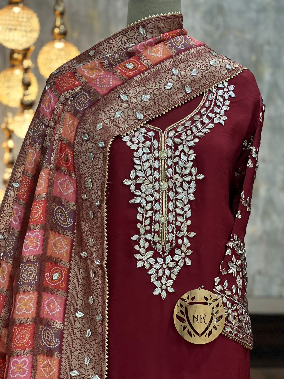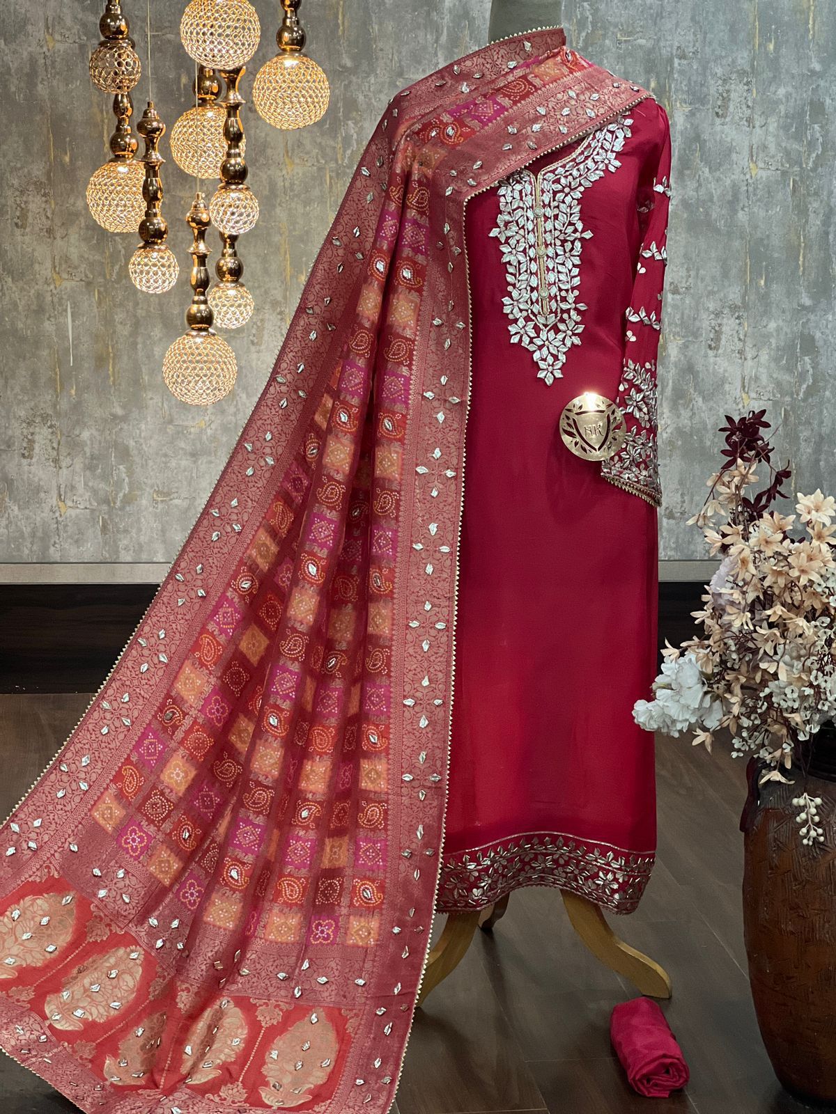 Organza satin kurta with gota work on nack line sleeves & ghera Bandhej jacquard Duppatta with gota work