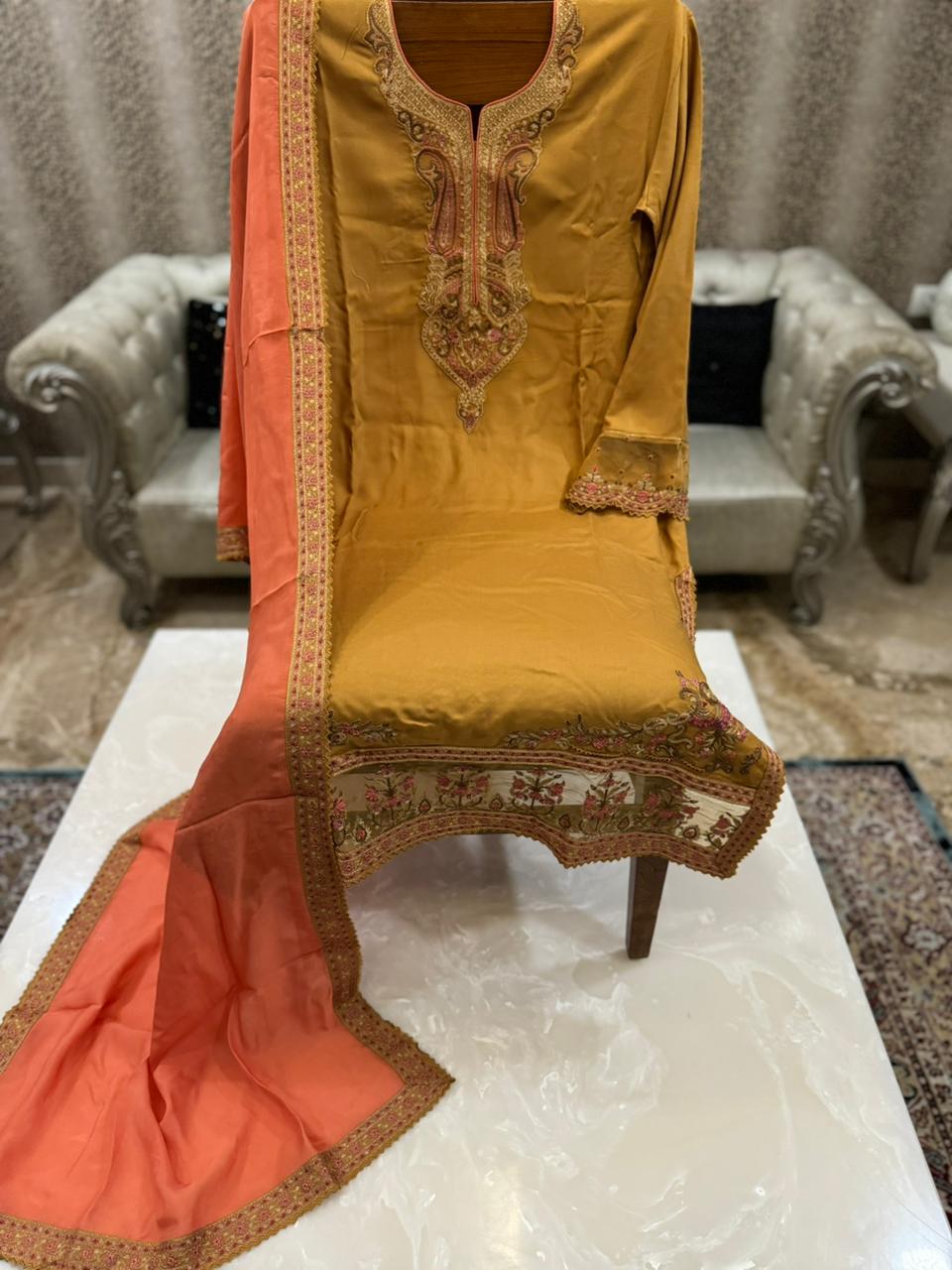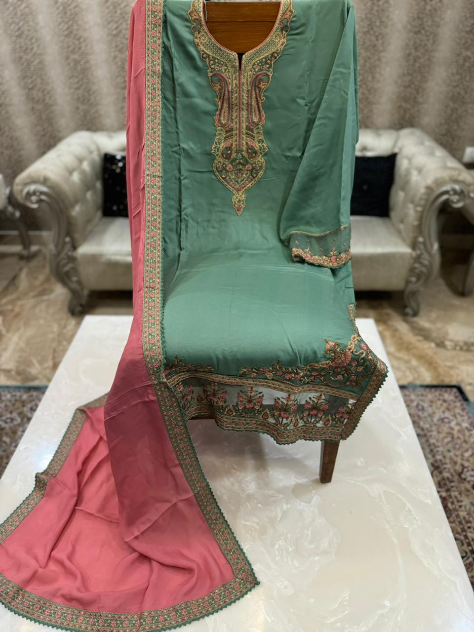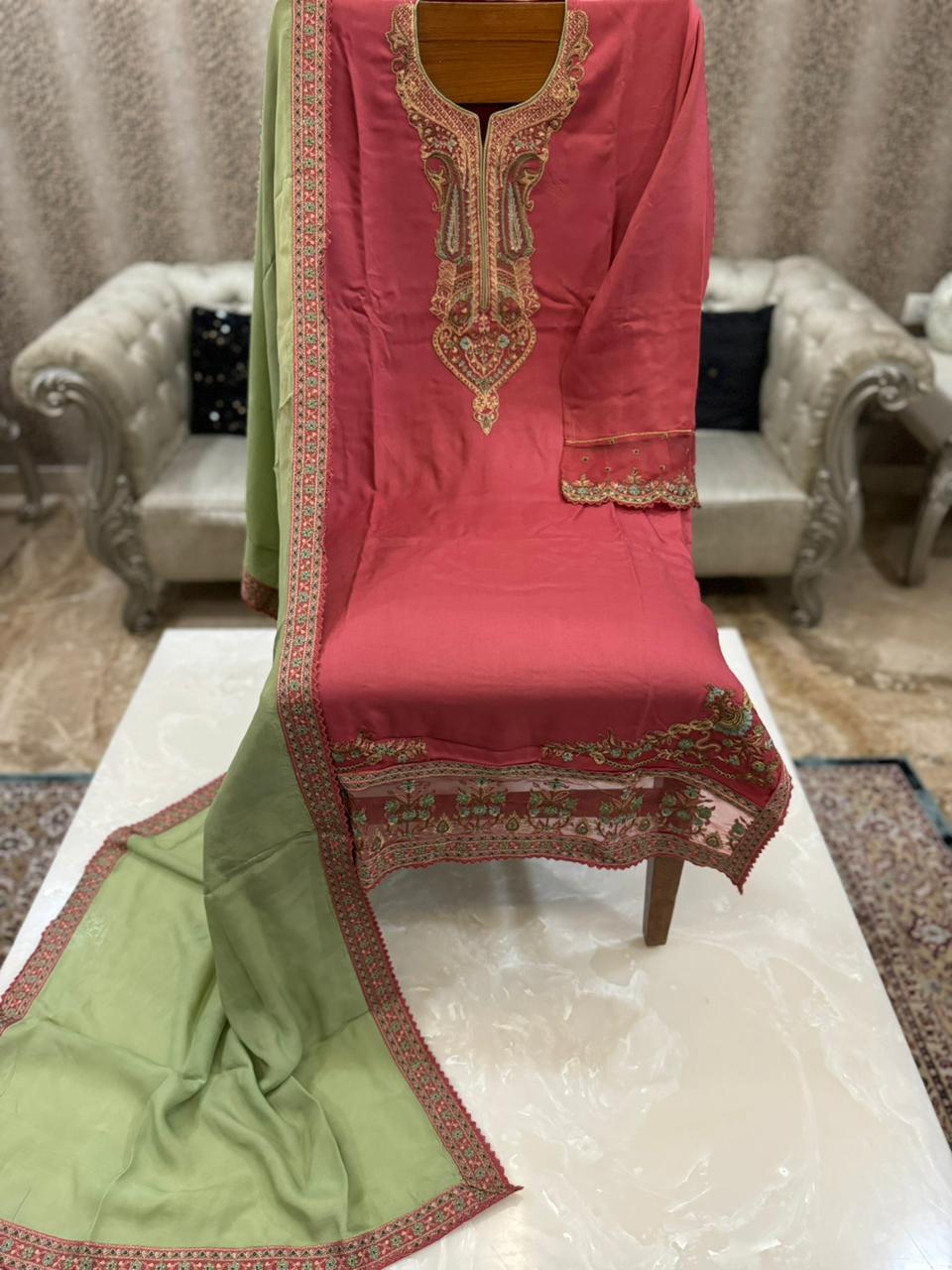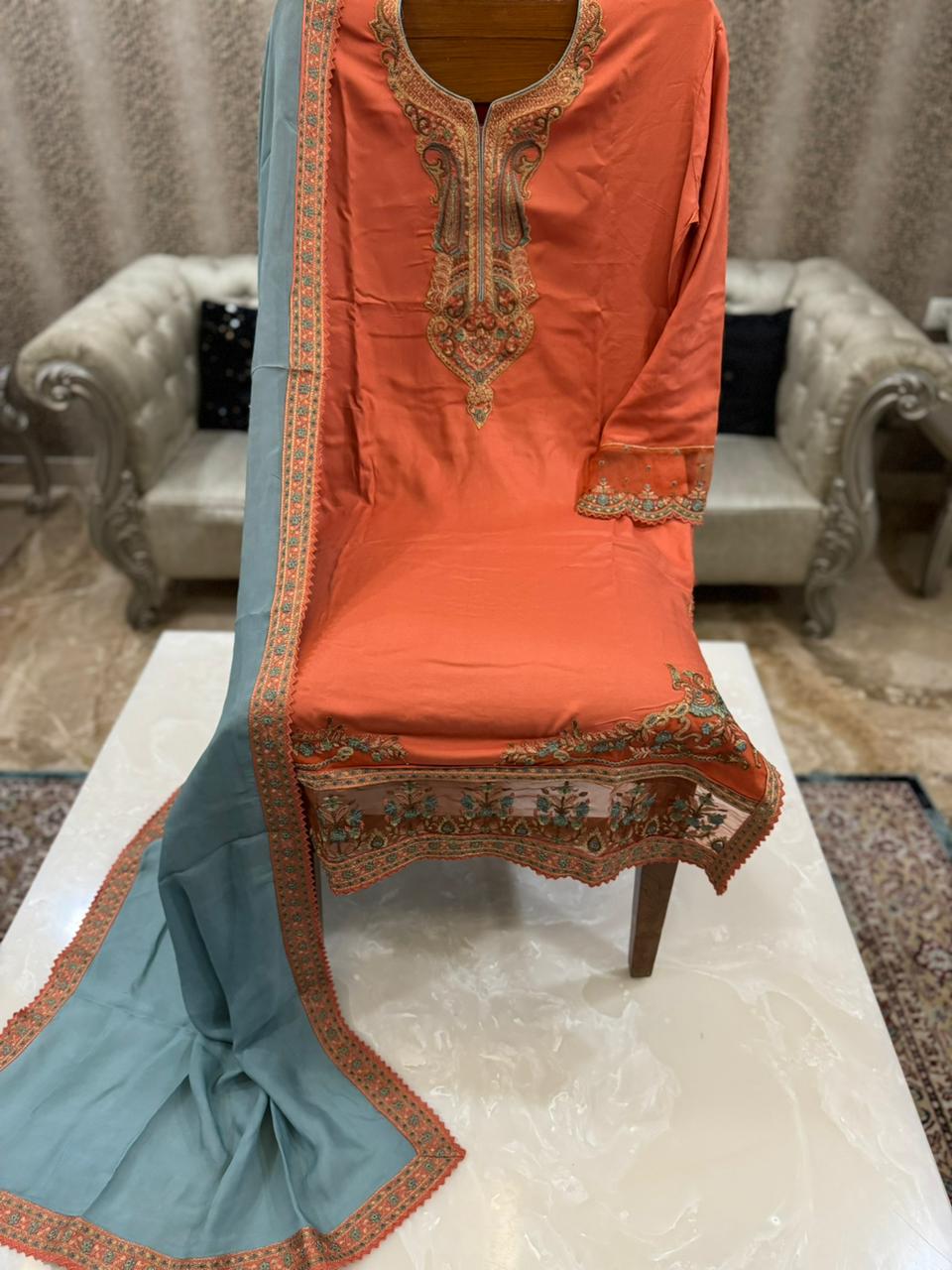 Pure pashmina embroidered top with embroidery sleeves, pashmina bottom n organz dupp with embroidery 4 side borders