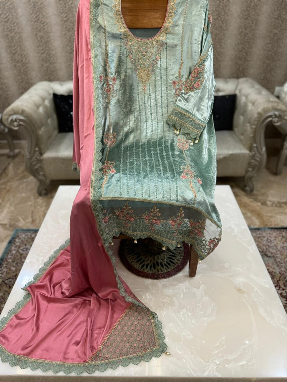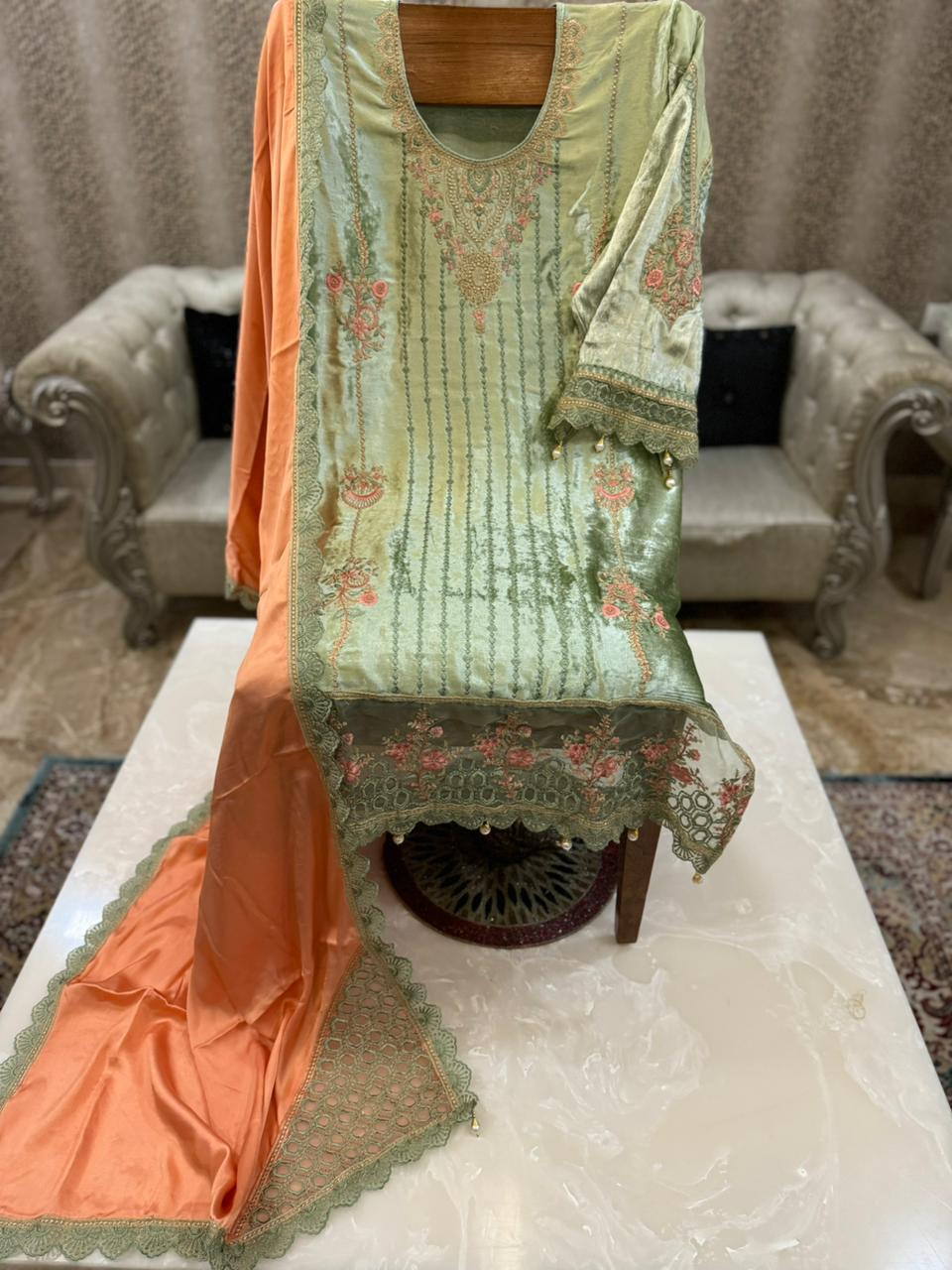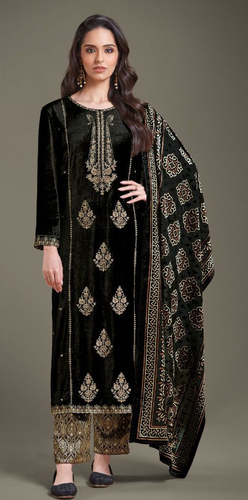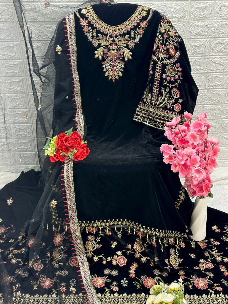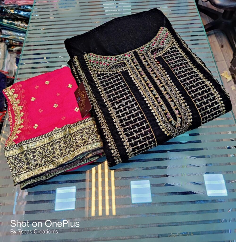 Pure velvet embroidered top with Cutwork sleeves and Daman , pure gaji silk dupatta with Cutwork borders and pashmina bottom Ships in 7-10 business days.