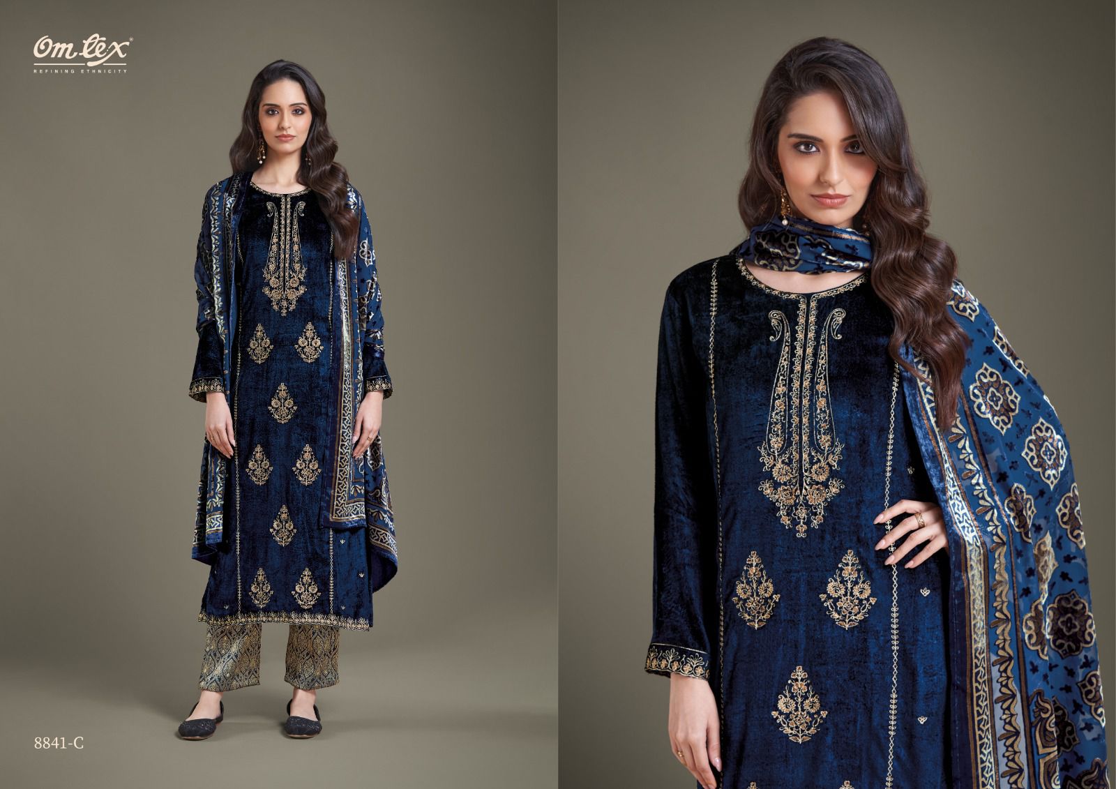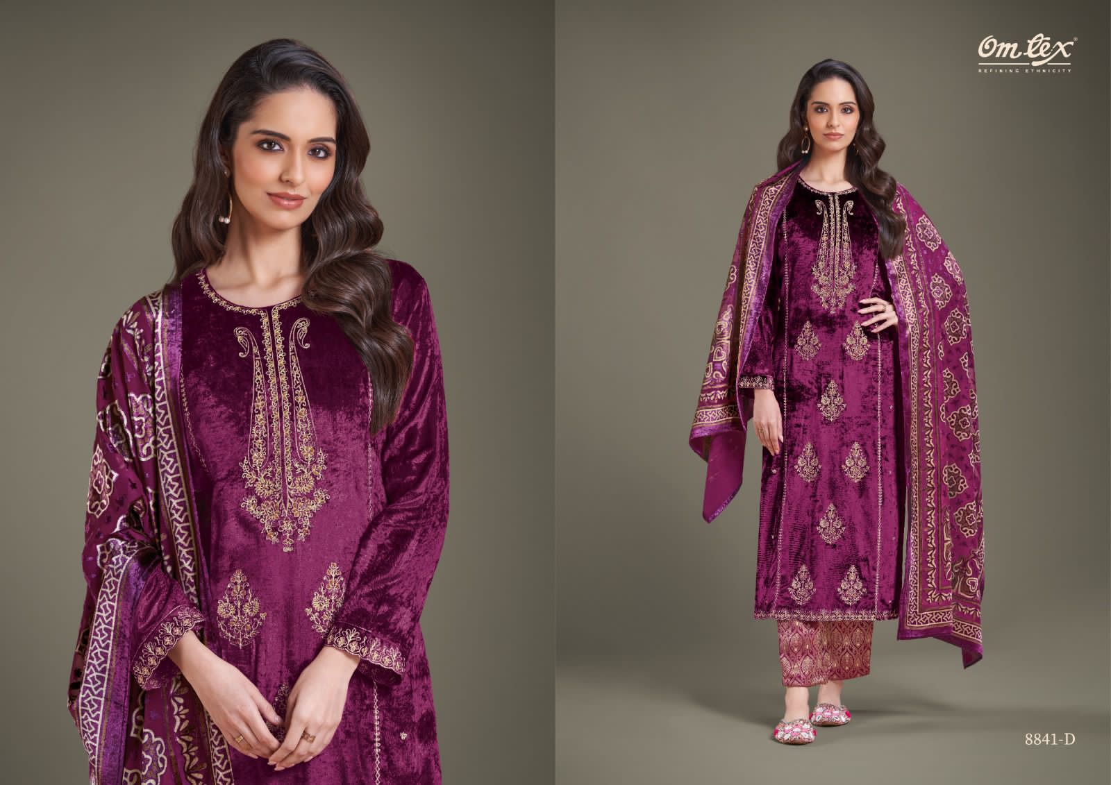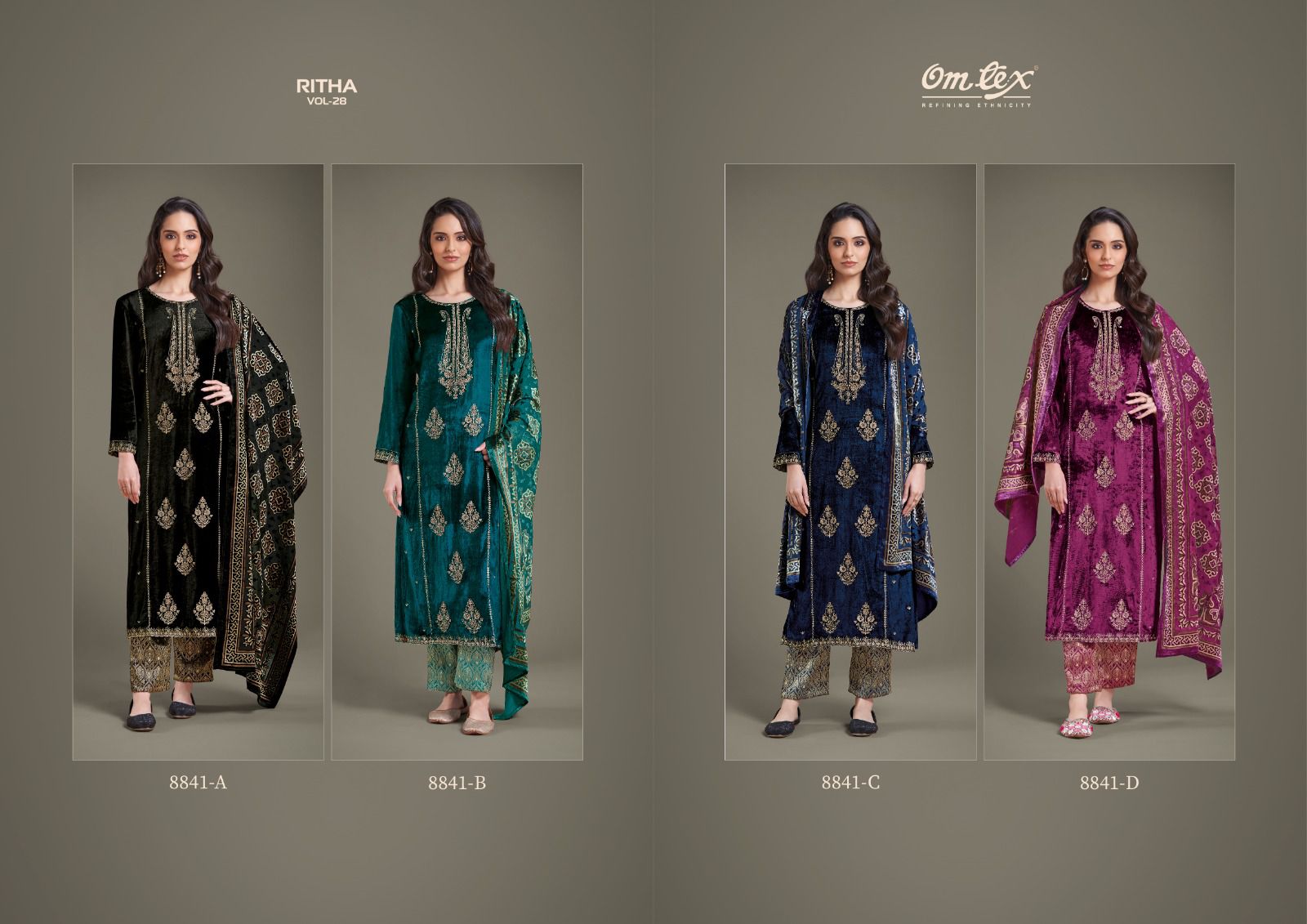 These are four different color variants of a velvet suit with intricate gold embroidery, showcased by the same model. The suits are part of the “RITHA VOL-28” collection by Omtex.